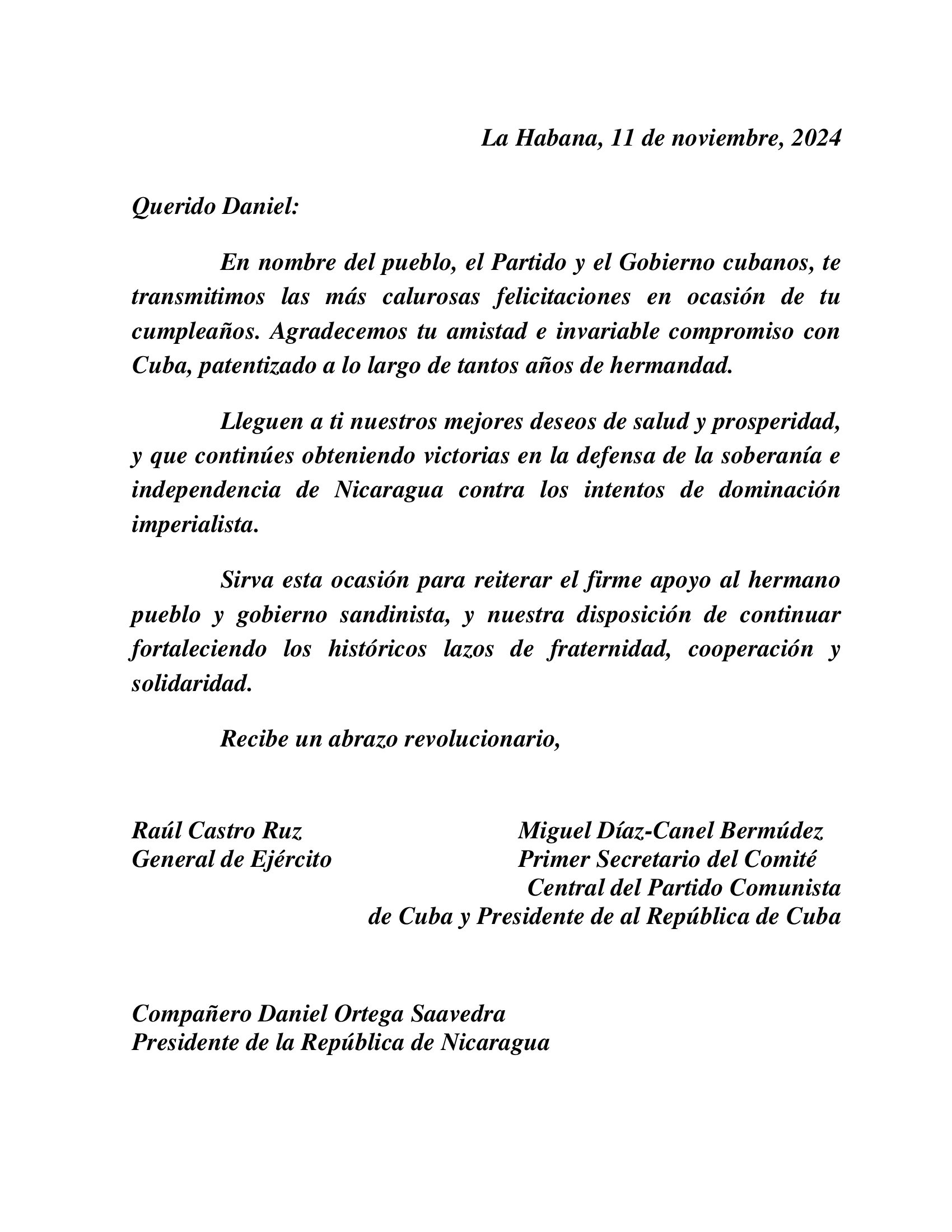 Lleguen a ti nuestros mejores deseos de salud y prosperidad, y que continúes obteniendo victorias en la defensa de la soberanía e independencia de Nicaragua contra los intentos de dominación imperialista.
