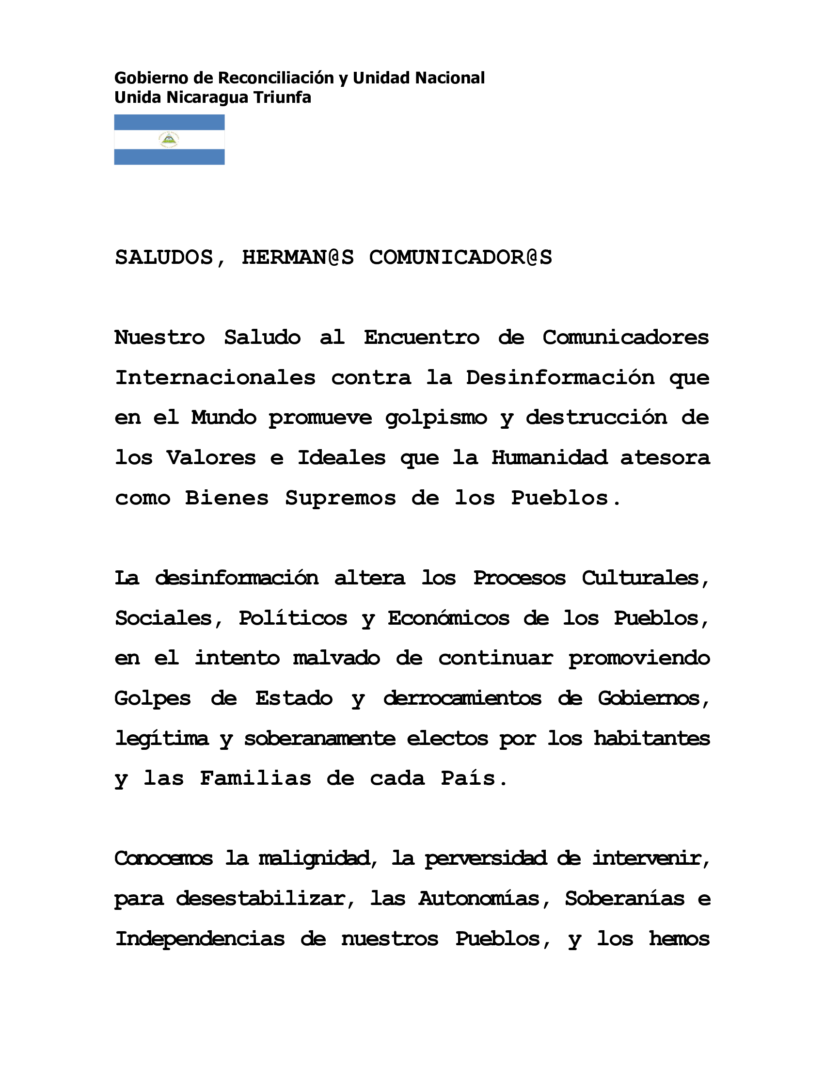 Nuestro Saludo al Encuentro de Comunicadores Internacionales contra la Desinformación que en el Mundo promueve golpismo y destrucción de los Valores e Ideales que la Humanidad atesora como Bienes Supremos de los Pueblos.