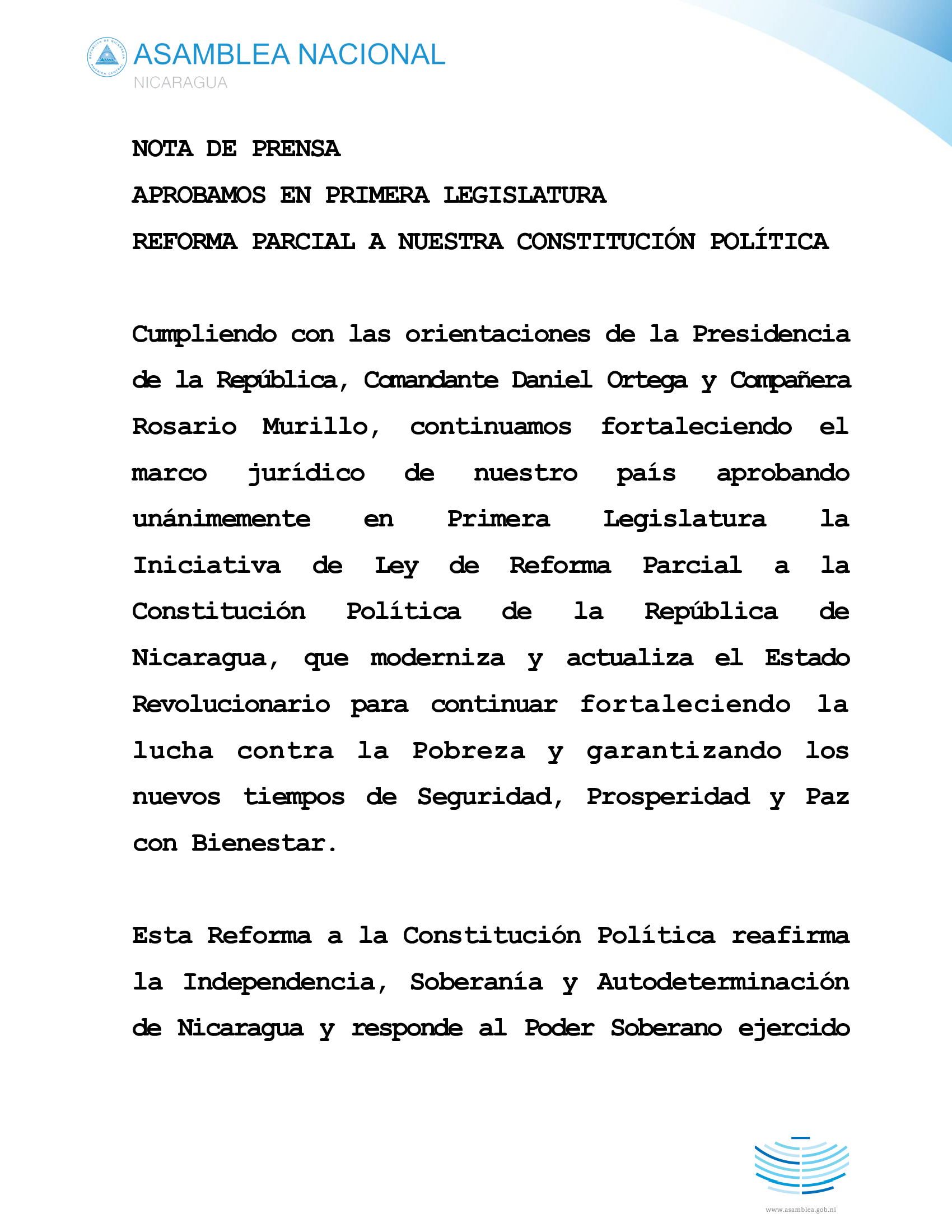 Cumpliendo con las orientaciones de la Presidencia de la República, Comandante Daniel Ortega y Compañera Rosario Murillo, continuamos fortaleciendo el marco jurídico de nuestro país aprobando unánimemente en Primera Legislatura la Iniciativa de Ley de Reforma Parcial a la Constitución Política de la República de Nicaragua, que moderniza y actualiza el Estado Revolucionario para continuar fortaleciendo la lucha contra la Pobreza y garantizando los nuevos tiempos de Seguridad, Prosperidad y Paz con Bienestar.