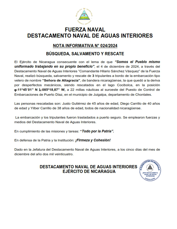 El Ejército de Nicaragua consecuente con el lema de que “Somos el Pueblo mismo uniformado trabajando en su propio beneficio”, el 4 de diciembre de 2024, a través del Destacamento Naval de Aguas Interiores “Comandante Hilario Sánchez Vásquez” de la Fuerza Naval, realizó búsqueda, salvamento y rescate de 3 tripulantes a bordo de la embarcación tipo velero de nombre “Señora de Altagracia”, de bandera nicaragüense, la que quedó a la deriva por desperfectos mecánicos, siendo rescatados en el lago Cocibolca, en la posición j:11°45´01” N l:085°18,87” W, a 22 millas náuticas al suroeste del Puesto de Control de Embarcaciones de Puerto Díaz, en el municipio de Juigalpa, departamento de Chontales.