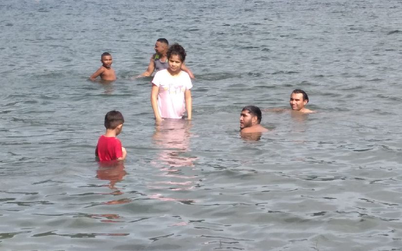 Jimmy Santos, de Ciudad Belén en el Distrito Siete de la capital, dijo que junto a la familia disfrutó de las aguas de la laguna, que amaneció fresca este domingo 8 de diciembre, "ando con mi hijo también, estamos alegres".