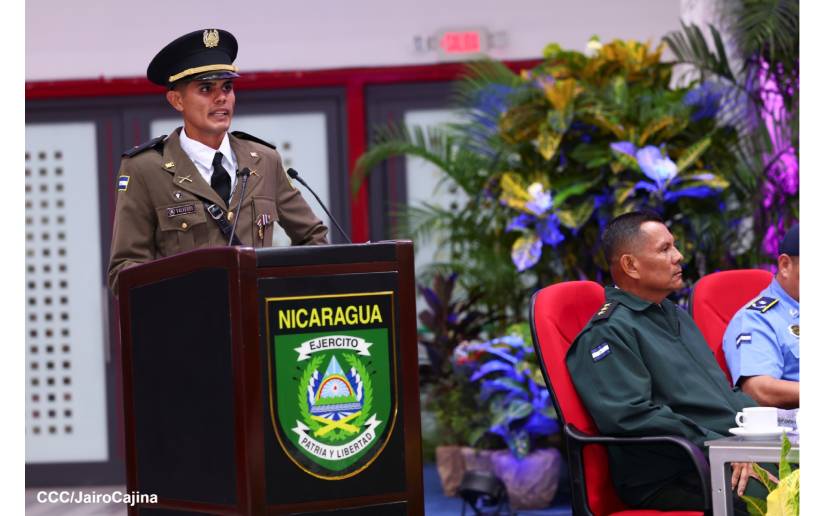 Agregó que “con orgullo y compromiso patriótico, nos incorporamos a formar parte de las filas del glorioso y heroico Ejército de Nicaragua. Los graduandos asumimos el compromiso de que, en todos nuestros actos, nada esté por encima de los intereses de la nación y que nuestro desempeño esté en estricto apego a los principios y valores institucionales”.