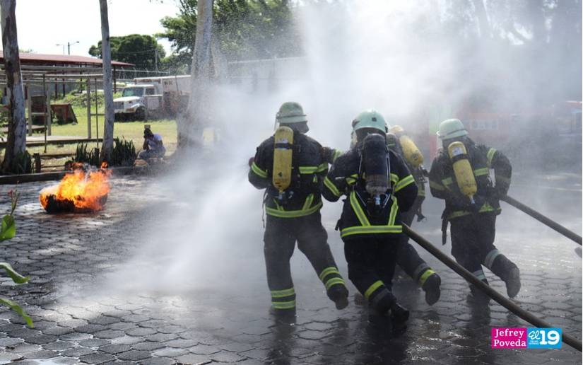 Futuros miembros de Bomberos Unidos de Nicaragua se trasladaron a la Academia Nacional de Bomberos, en Managua, para llevar a cabo ejercicios demostrativos con el fin de adquirir habilidades en el uso de trajes y mangueras especializadas en la extinción de incendios.