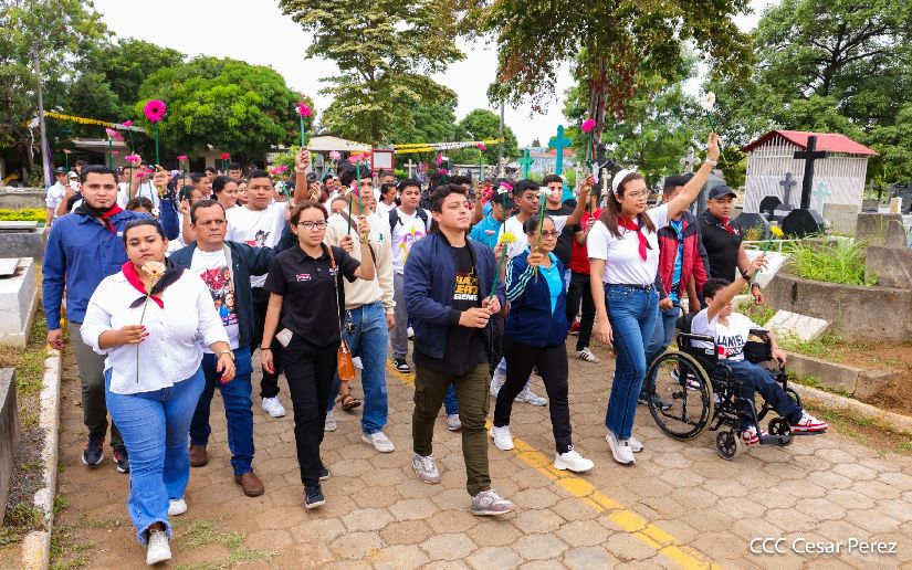 Desde el cementerio Periférico, los jóvenes revolucionarios colocaron ofrendas florales en el sitio donde reposan los restos inmortales de Contreras, cuyo ejemplo abrió la brecha de una lucha que permitió la liberación del pueblo nicaragüense de las garras de una dictadura cruel y sangrienta.