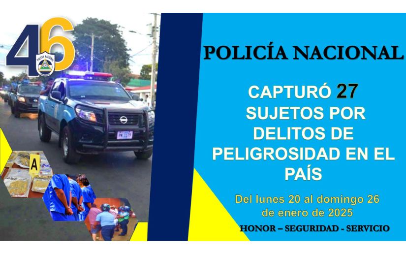 Un total de 27 delincuentes de alta peligrosidad capturó la Policía Nacional durante el período comprendido del lunes 20 al domingo 26 de enero de 2025, según confirmó este lunes la institución uniformada.