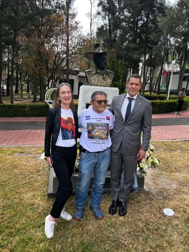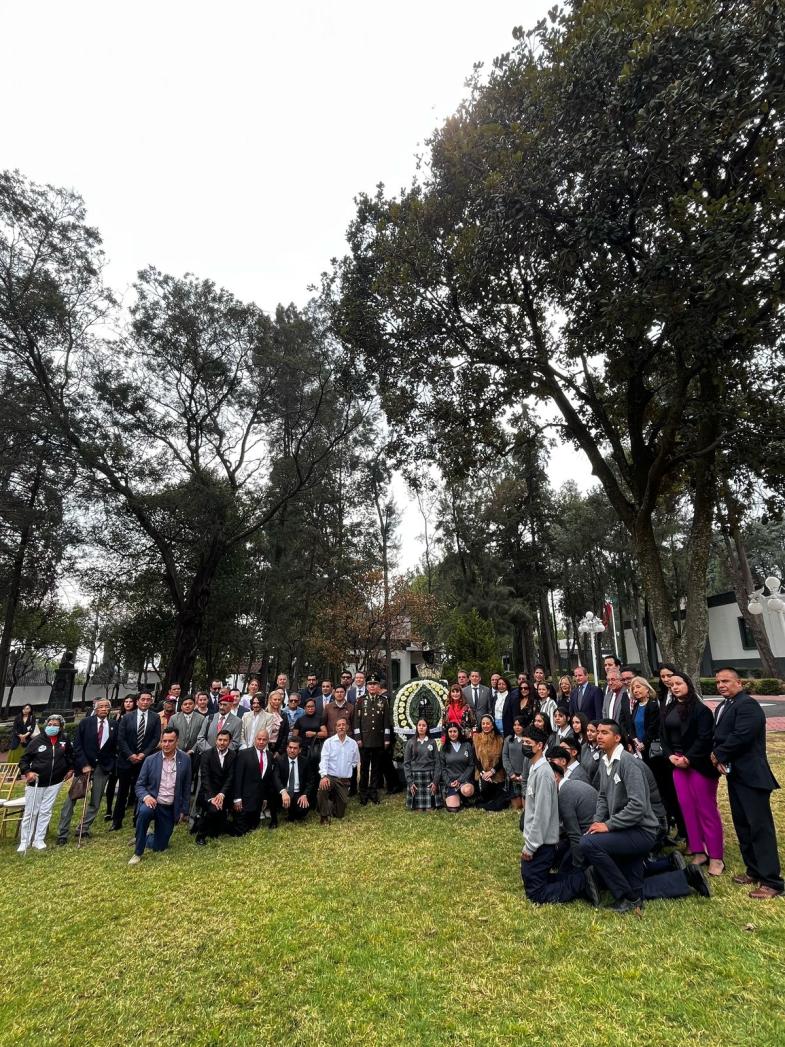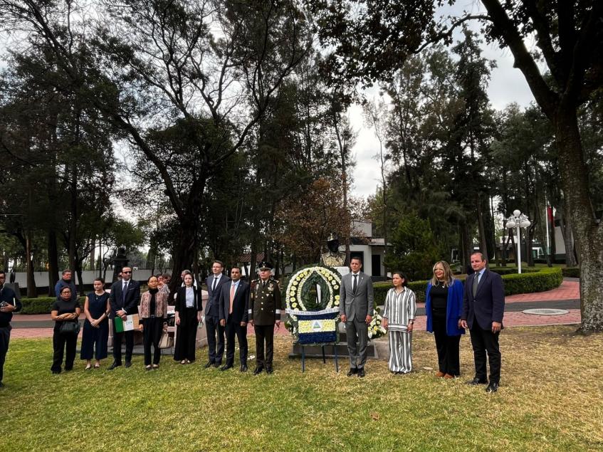 Miembros del Cuerpo Diplomático, Representantes de Organismos Internacionales acreditados en México e Invitados Especiales, colocaron una ofrenda floral en el Busto del General Augusto C. Sandino. A la vez, Representantes de la Organización Mundial por la Paz (WOFP), llevaron arreglos florales al General Sandino.