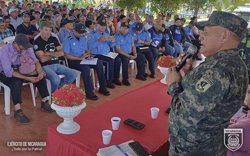 El Ejército de Nicaragua consecuente con el lema de que “Somos el Pueblo mismo uniformado trabajando en su propio beneficio”, el 22 de febrero de 2025, a través del jefe del 1 Comando Militar Regional Coronel Inf. DEM Fabio de Jesús Zelaya Reyes, participó en reunión con 820 productores, transportistas y comerciantes de los municipios de San Fernando y Jalapa, departamento de Nueva Segovia, con el objetivo de conocer sus planteamientos relacionados al fortalecimiento del Plan Permanente de Seguridad en el Campo, lucha contra el abigeato y el narcotráfico.