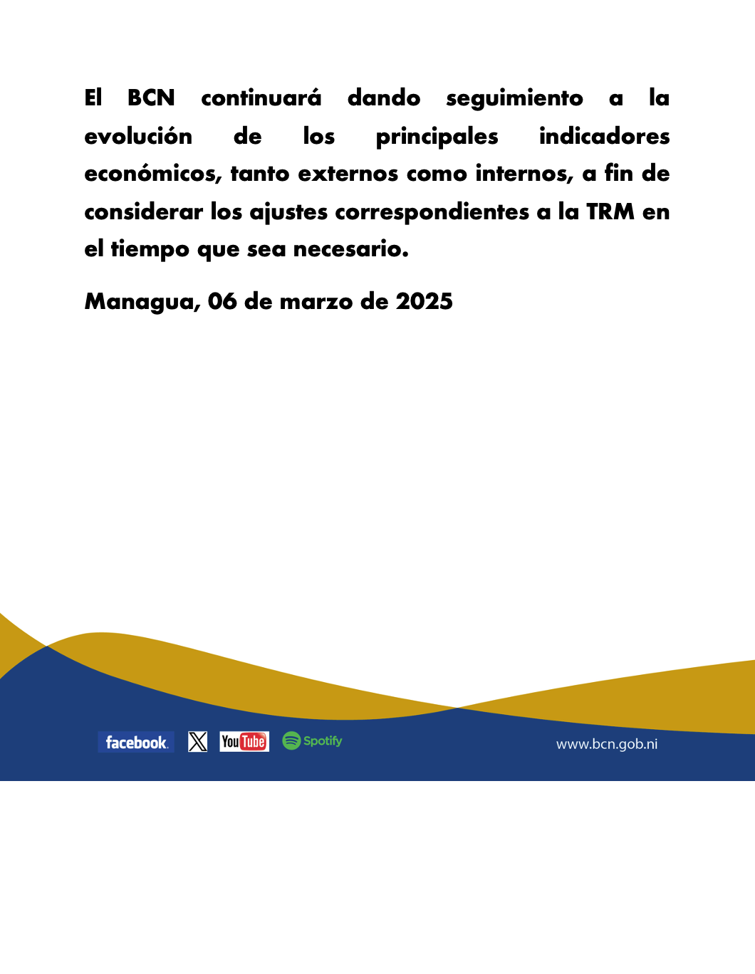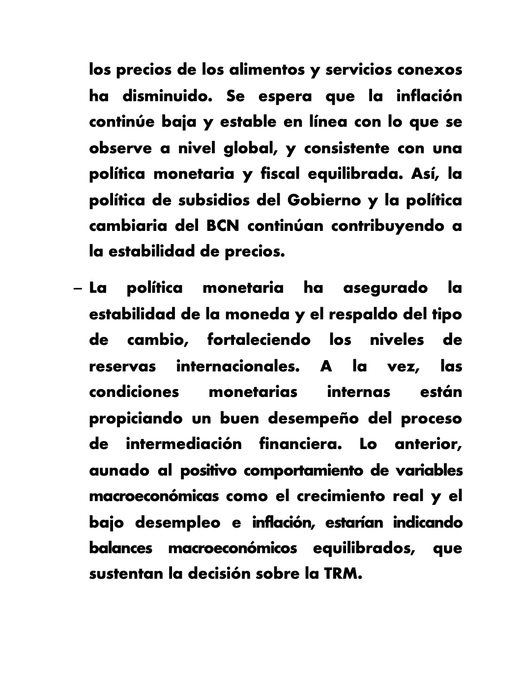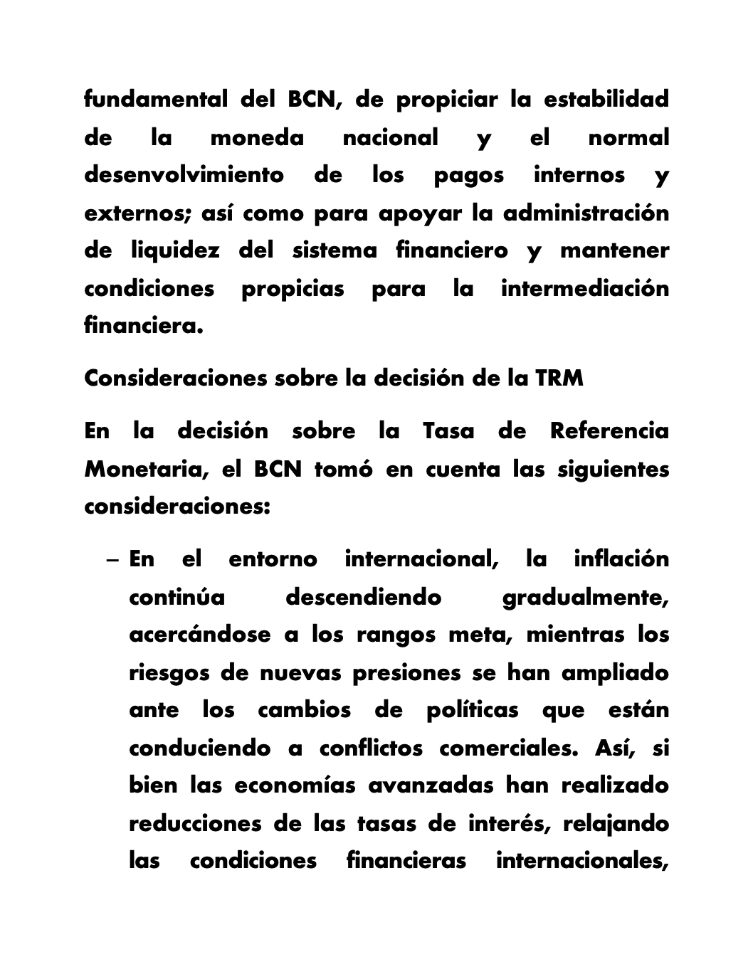 El BCN continuará dando seguimiento a la evolución de los principales indicadores económicos, tanto externos como internos, a fin de considerar los ajustes correspondientes a la TRM en el tiempo que sea necesario.