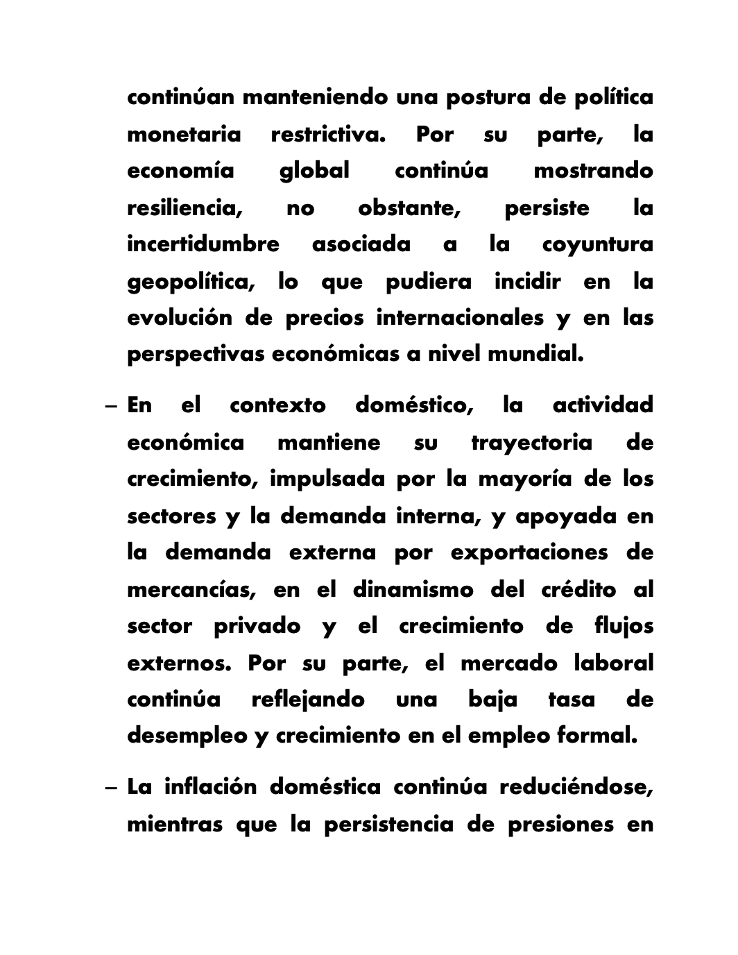- En el entorno internacional, la inflación continúa descendiendo gradualmente, acercándose a los rangos meta, mientras los riesgos de nuevas presiones se han ampliado ante los cambios de políticas que están conduciendo a conflictos comerciales. Así, si bien las economías avanzadas han realizado reducciones de las tasas de interés, relajando las condiciones financieras internacionales, continúan manteniendo una postura de política monetaria restrictiva. Por su parte, la economía global continúa mostrando resiliencia, no obstante, persiste la incertidumbre asociada a la coyuntura geopolítica, lo que pudiera incidir en la evolución de precios internacionales y en las perspectivas económicas a nivel mundial.