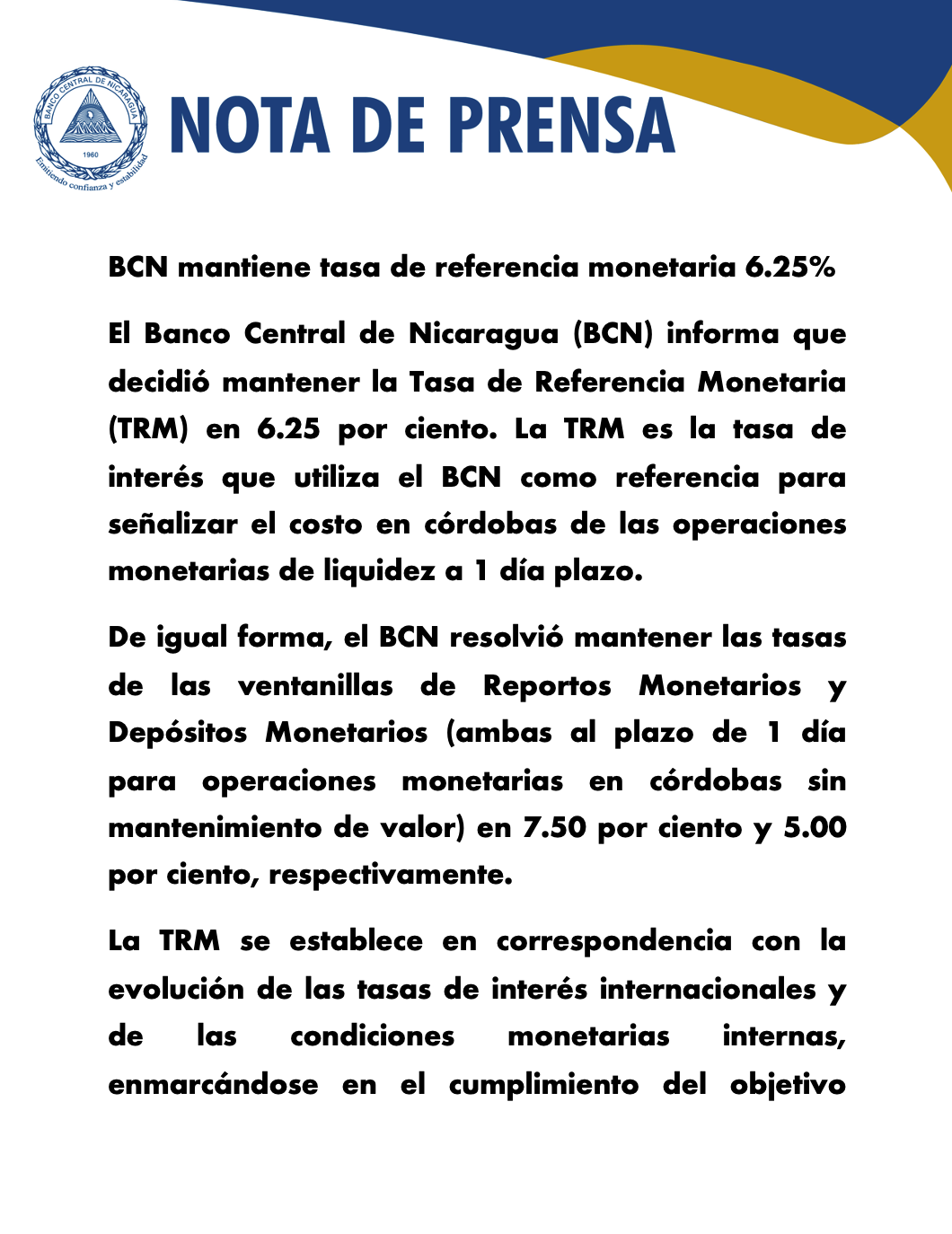 El Banco Central de Nicaragua (BCN) informa que decidió mantener la Tasa de Referencia Monetaria (TRM) en 6.25 por ciento. La TRM es la tasa de interés que utiliza el BCN como referencia para señalizar el costo en córdobas de las operaciones monetarias de liquidez a 1 día plazo.