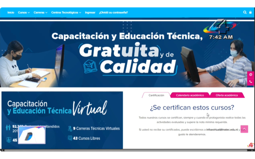 El responsable de Innovación y Tecnología del Inatec compartió que el 57% de protagonistas son mujeres haciendo uso de la plataforma en cursos virtuales, y aclaró que en los cursos pueden matricularse estudiantes de secundaria, de educación técnica, universitarios y egresados. “Hemos tenido experiencias, testimonios de compañeros, compañeras, familia que están trabajando y luego empiezan a estudiar una carrera técnica, por ejemplo, de contabilidad, de administración, asistente ejecutivo y eso sirve para escalar también profesionalmente que están en su institución o en una empresa X, en un nivel y luego, pues van fortaleciendo sus capacidades, eso va aumentando su conocimiento, su experiencia y de igual manera profesionalmente creciendo”.