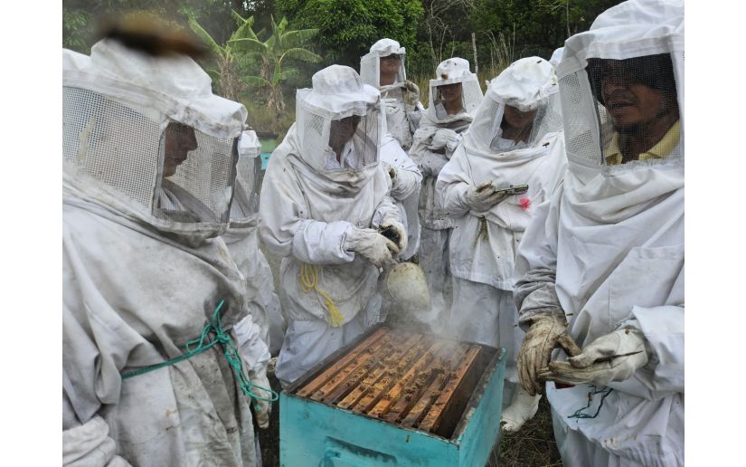 El INTA en el Centro de Desarrollo Tecnologías Agropecuarias Cornelio Silva, San Pedro de Lóvago, Chontales, presenta técnicas de alimentación artificial para colmenas en el invierno, con la participación de apicultores de la zona.