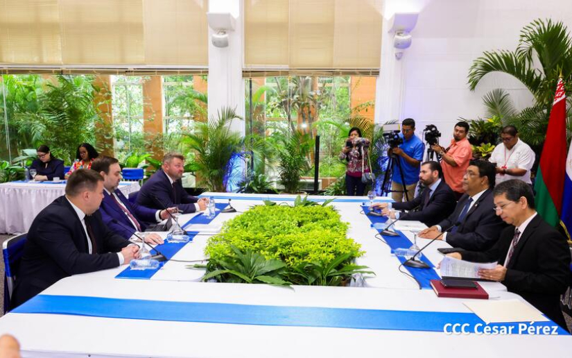 En la sede del Ministerio de Relaciones Exteriores se celebró un encuentro entre el Canciller de la República, compañero Valdrack Jaentschke y el Asesor Presidencial para la Promoción de las Inversiones, Comercio y Cooperación Internacional de Nicaragua, Laureano Ortega Murillo, con una importante delegación del Gobierno de Belarús, encabezada por el Viceministro de Asuntos Exteriores Evgeny Shestakov y Alexander Egorov, representantes del Presidente de Belarús para asuntos con Nicaragua.
