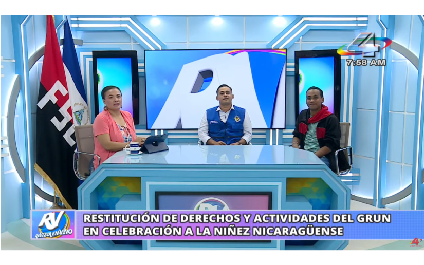 La Revista en Vivo de Canal 4 tuvo como invitados en la entrevista central a los compañeros Henry Álvarez, director de Restitución y Garantías de Derechos del Ministerio de la Familia y Roger Membreño, coordinador de Promotoría Solidaria de Juventud Sandinista 19 de Julio en Managua, quienes abordaron la celebración del Día del Niño y la Niña, los Mimados de la Revolución.