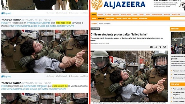 Así, una de las fotos divulgadas en Twitter supuestamente de una protesta en Caracas en realidad corresponde a una imagen publicada durante las protestas estudiantiles en Chile.