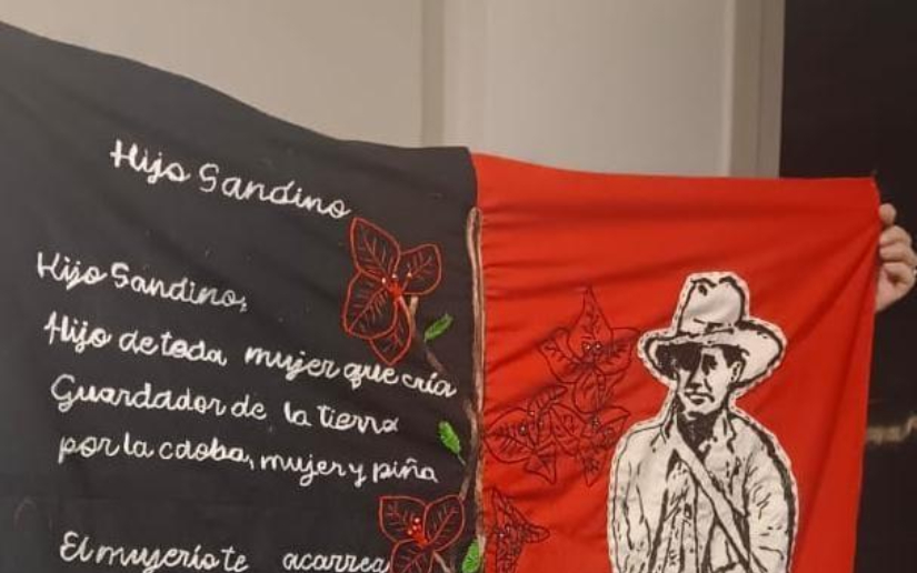 Las Compañeras Sandra Cornejo (Paloma Rodríguez), también Cantautora, Inés Pérez y Nora Soto, quienes viajarán desde Chile a nuestro 46/19, bordaron Telón-Lienzo que lleva por nombre “Hijo Sandino”, Poema de Gabriela Mistral, y, la imagen de nuestro General, unidos por Buganvillas.