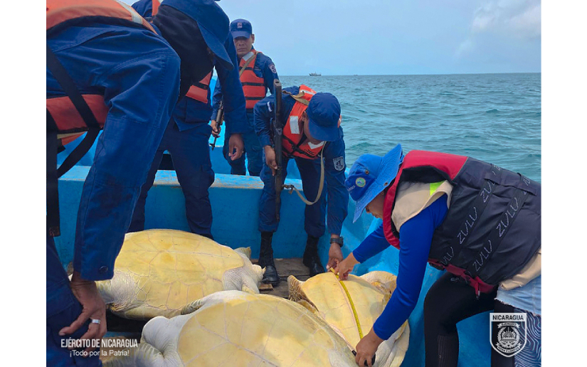 De igual manera, durante acompañamiento a una comisión del Instituto Nicaragüense de la Pesca y Acuicultura (INPESCA), a los centros de acopios y embarcaciones que realizan faena de pesca en los Cayo Miskitos, se ocupó 4 tortugas verdes de la especie “Chelonia Mydas”, que eran trasladadas de manera ilegal, a bordo de la embarcación tipo velero de nombre “Miss Merijin”.