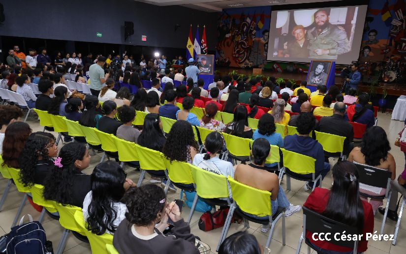 Desde el Auditorio Fernando Gordillo de la UNAN-Managua, Francisco Ríos, presidente de UNEN UNAN-Managua, destacó que estos dos grandes hombres, el Comandante Tomás y el Comandante Fidel dedicaron su vida en la lucha por la Revolución.