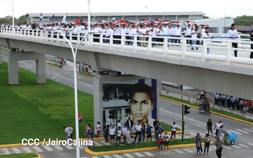 En cuatro bloques numerosos, jóvenes y bandas musicales provenientes del este y oeste, caminaron por ambas vías del puente desnivel y se unieron en una verdadera fiesta portando las banderas de la patria y la del FSLN.