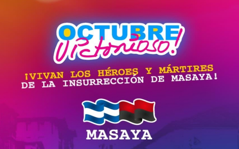 • Caminata “Todos Juntos, Octubre Siempre Victorioso” recorriendo las calles llenas de historia de nuestro heroico pueblo. Viernes 17 de Octubre, Saliendo de Nindiri hacia el Parque Central de Masaya, 3:00 PM.
