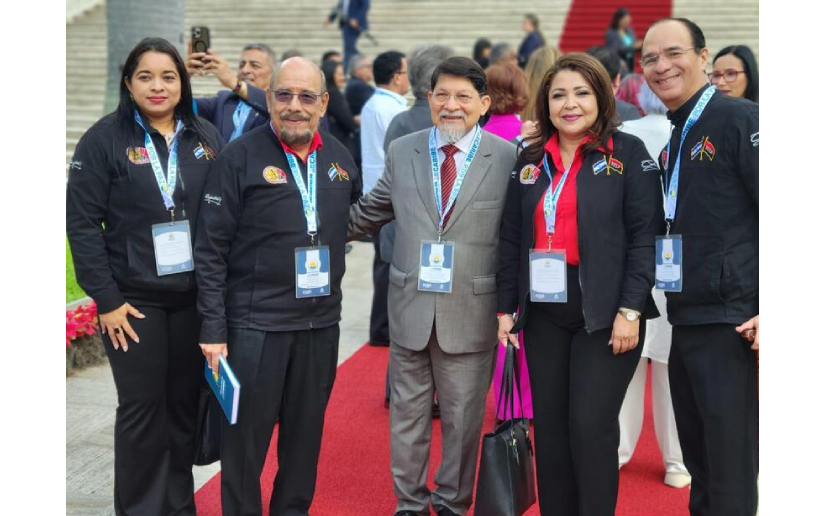 Destacó la participación de la delegación nicaragüense. "Ahí está nuestro canciller Denis, está la compañera Arling Alonso, vicepresidenta primera de la Asamblea Nacional. Está Edwin, jefe de bancada del Frente Sandinista, Carlos Emilio, Yitsy, diputados y está Daysi, nuestra embajadora, junto a su equipo de consejeros Valezka y César Acosta".