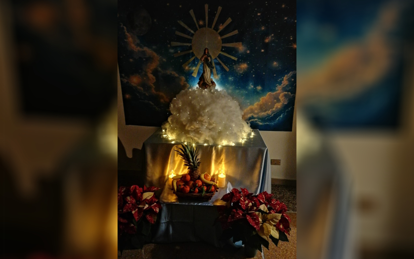 En el centro del altar, la Virgen María, elevada sobre un pedestal y rodeada de luces y velas, evoca de manera sencilla pero poderosa, la dignidad y la resiliencia de nuestro pueblo.