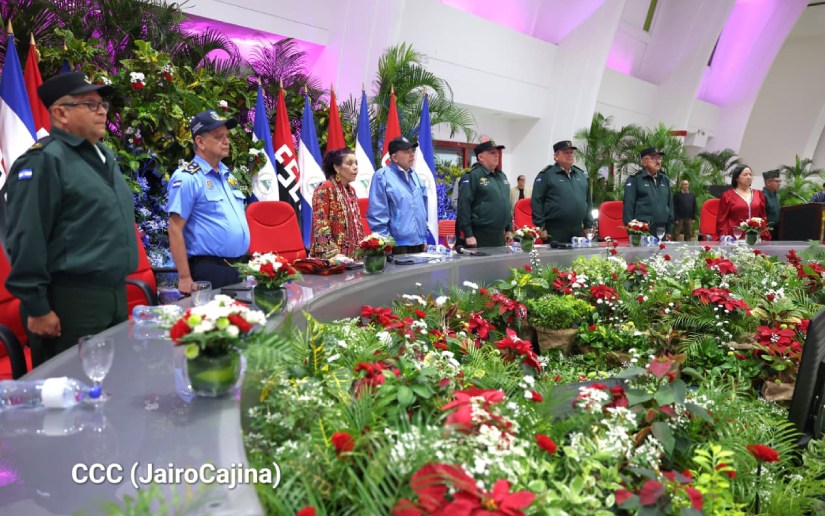 Los Copresidentes de la República, Comandante Daniel Ortega Saavedra y la Compañera Rosario Murillo, presiden junto al General de Ejército Julio César Avilés Castillo, la XXX Graduación de Cadetes del Centro Superior de Estudios Militares "General de División José Dolores Estrada Vado".