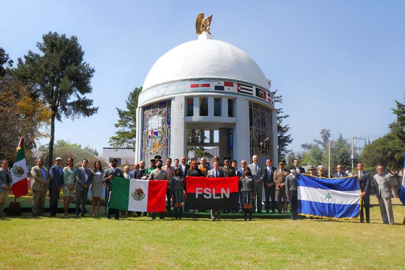Los Embajadores de Irán, Nicaragua, República Árabe Saharaui Democrática, Rusia, y representantes de China, Costa de Marfil, Guatemala, Jordania, autoridades de la Escuela Superior de Guerra y de la Secretaría de Relaciones Exteriores de México, colocaron una ofrenda floral en el Busto del General Augusto C. Sandino.