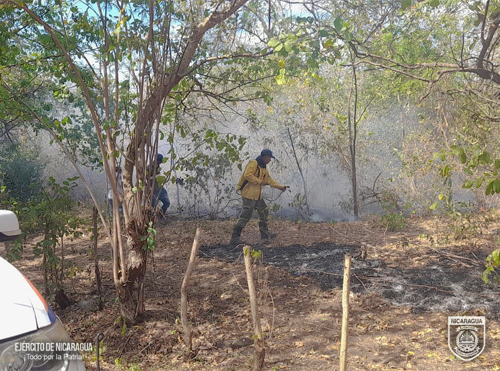 El Ejército de Nicaragua consecuente con el lema de que “Somos el Pueblo mismo uniformado trabajando en su propio beneficio”, el 5 de marzo de 2026, a través del Estado Mayor de la Defensa Civil, en coordinación con los Bomberos Unidos del Ministerio del Interior (BU-MINT) y Brigadas Contra Incendios del Ingenio San Antonio (ISA) del municipio de Chichigalpa, departamento de Chinandega, participaron en sofocación de incendio agropecuario en la finca “El Rancho”, ubicada en la comunidad Los Alpes, municipio de León, departamento de León, logrando extinguir un fuego en un área de 12 manzanas de maleza.