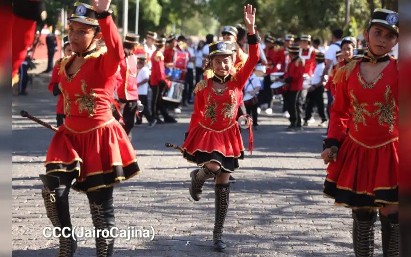 Estudiantes de colegios públicos del municipio de Managua desfilaron en bandas rítmicas para conmemorar al 46.º aniversario del inicio de la Gran Cruzada Nacional de Alfabetización.
