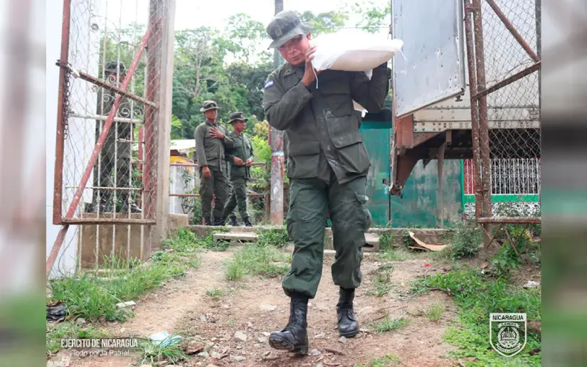 El Ejército de Nicaragua consecuente con el lema de que “Somos el Pueblo mismo uniformado trabajando en su propio beneficio”, el 24 de abril de 2026, a través del Batallón Ecológico “BOSAWAS”, en coordinación con el Ministerio de Educación (MINED), participó en el descargue de 1,506 quintales de alimentos (arroz, frijoles, harina, cereal) y 4,736 litros de aceite, en las bodegas del MINED, de los municipios de Siuna y Rosita, Región Autónoma de la Costa Caribe Norte, los que posteriormente serán distribuidos en 526 escuelas del área urbana y rural, beneficiando a 45,429 estudiantes.