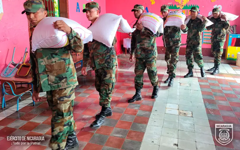 El Ejército de Nicaragua consecuente con el lema de que “Somos el Pueblo mismo uniformado trabajando en su propio beneficio”, el 25 y 26 de abril de 2026, a través del 5 Comando Militar Regional, en coordinación con el Ministerio de Educación (MINED), participó en el cargue y descargue de 170 quintales de alimentos (arroz, frijoles, maíz, cereal) y 779.76 litros de aceite, en la Escuela Especial “Padre Miguel Gonfia Lazari”, posteriormente, se trasladó a diferentes centros escolares del municipio de Juigalpa, departamento de Chontales, beneficiando a 1,320 alumnos.