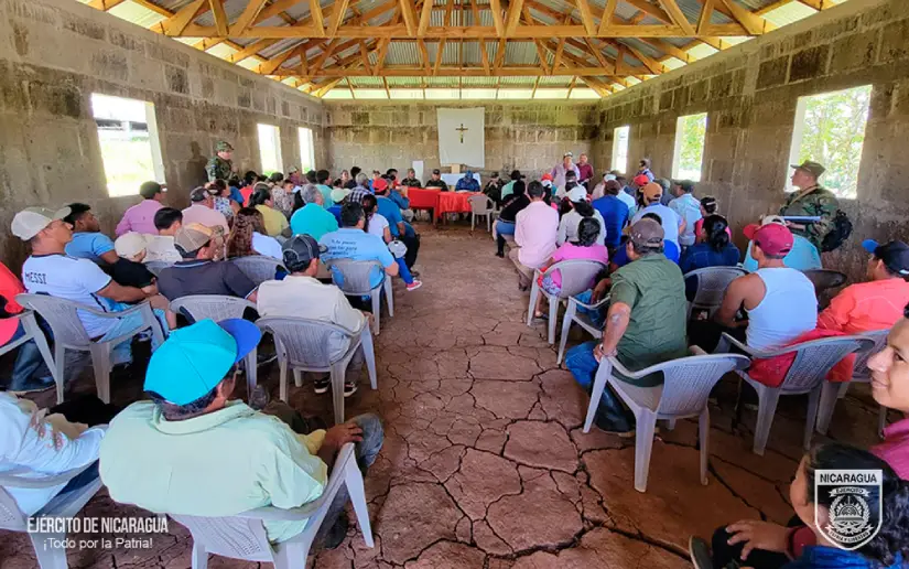 El Ejército de Nicaragua consecuente con el lema de que “Somos el Pueblo mismo uniformado trabajando en su propio beneficio”, el 28 de abril de 2026, a través del jefe del 5 Comando Militar Regional, Coronel Inf. DEM Sergio Amílcar Rodríguez Gutiérrez, acompañado por el jefe del Distrito Naval Caribe, Capitán de Navío DEMN Abelino Andrés Fonseca Miranda y el jefe del Destacamento Militar Sur, Coronel Inf. DEM Ronald Téllez Soza, participaron en reunión con 200 productores de las diferentes comunidades del municipio de Nueva Guinea, Región Autónoma Costa Caribe Sur, con el objetivo de evaluar y escuchar sus planteamientos relacionados al fortalecimiento del Plan Permanente de Seguridad en el Campo, Plan de Lucha Contra el Abigeato y del Plan de Protección de los Recursos Naturales y el Ambiente.