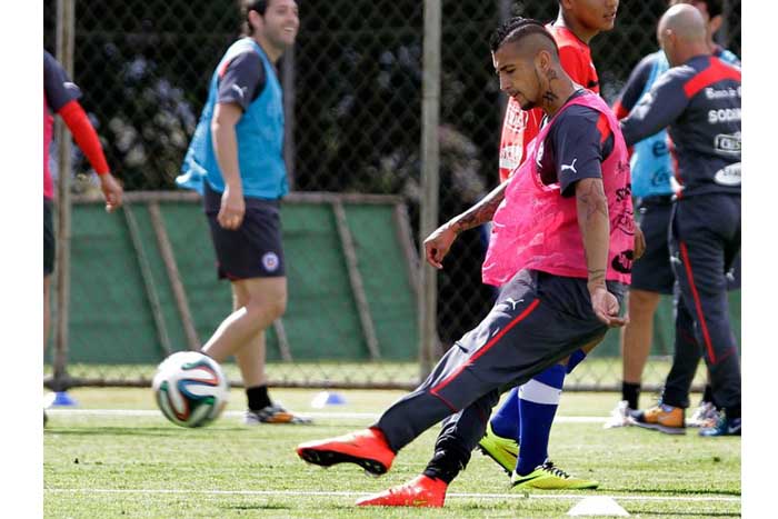 Si bien Vidal práctico con mejor ánimo que los días anteriores, no fue exigido por sus compañeros ni tampoco le pegó con dureza a la pelota durante los 15 minutos que el técnico Jorge Sampaoli permitió a la prensa observar la práctica.