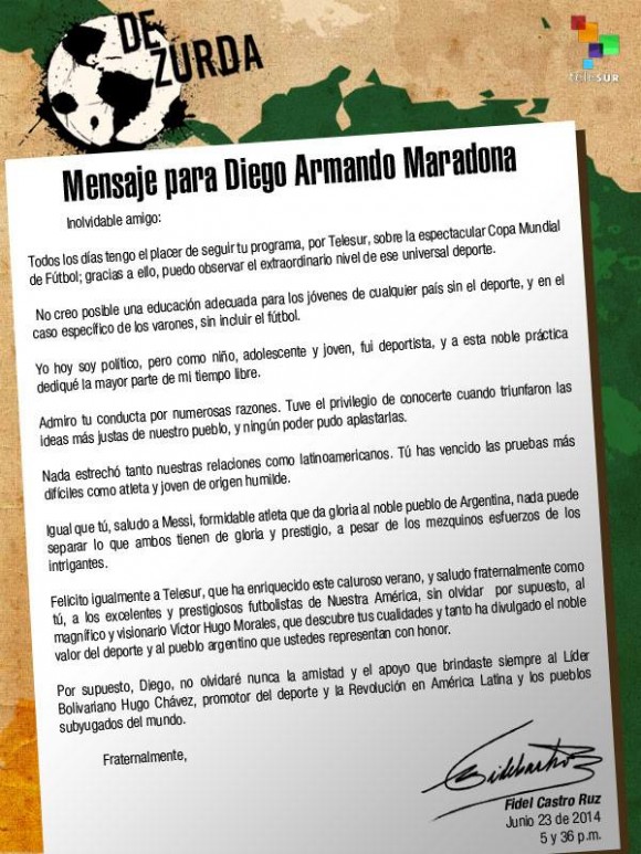 El Comandante en Jefe de la Revolución Cubana Fidel Castro Ruz envió un mensaje al Pibe de Oro Diego Armando Maradona, con motivo de su exitoso programa De Zurda, en la cadena Telesur, junto al reconocido periodista Víctor Hugo Morales.