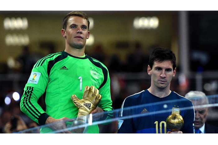 Apesadumbrado por la derrota, el futbolista argentino recorrió los cien metros hasta el palco, donde recibió del presidente de la FIFA, el suizo Joseph Blatter, un balón dorado que le acredita como el futbolista más valioso de Brasil.