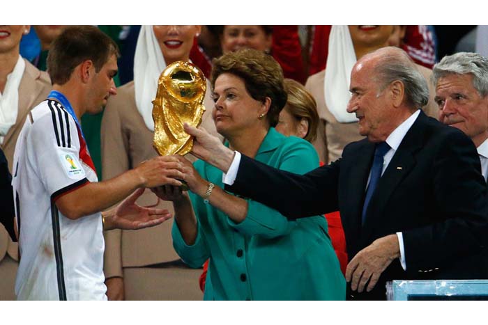 Philipp Lahm, capitán alemán, recogió el trofeo de la Copa del Mundo de manos de la presidenta de Brasil, Dilma Rousseff, que en compañía del presidente de la FIFA; Joseph Blatter, recibió una sonora pitada en el momento en que se situaron por delante del palco para entregar los premios.