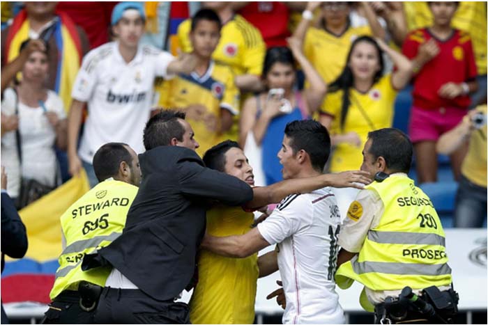 Al ver lo que estaba sucediendo, James intervino con los agentes pidiéndoles calma e inclusive ayudó a escoltar al fanático hacia las gradas no sin antes regalarle un balón. Un gesto muy noble por parte de James que quizás salvó al muchacho de recibir algún golpe para lamentar.