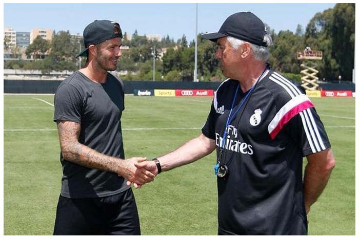 El británico David Beckham asistió al entrenamiento del Real Madrid durante una sesión que sirvió como preparación para el primer partido de pretemporada que disputarán los merengues este sábado en Berkeley (California).