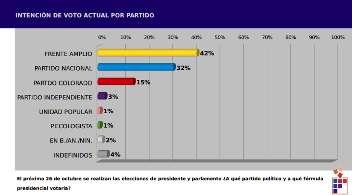 La consulta realizada en el mes de setiembre, con un margen de error de más o menos el 3,2 por ciento, marca que el Frente Amplio alcanza el 42 por ciento de las preferencias, mientras que el Partido Nacional posee el 32 por ciento y el Partido Colorado el 15 por ciento.