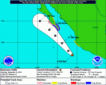 Una alerta de huracán fue emitida este sábado por la tarde para parte de la Península de Baja California, México, ante la potencial amenaza que representa el huracán Odile, que ya alcanzó la categoría 2.
