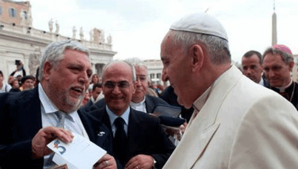 El padre Antonio Tarzia, de la asociación Cassiodoro, y el profesor Luciano Vasapollo, docente de la Universidad La Sapienza, entregaron la misiva al sumo pontífice en medio de una audiencia.