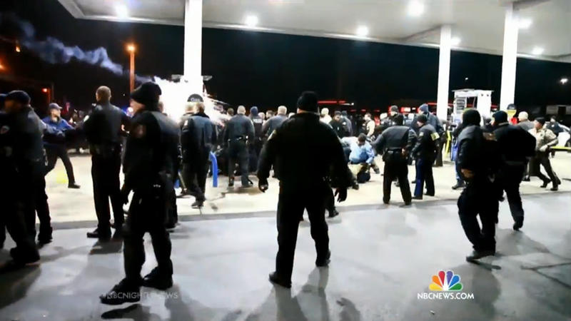 Las protestas fueron más tranquilas que la noche anterior, cuando unas 300 personas llegaron a la gasolinera donde arrojaron piedras y ladrillos en una escena que hizo recordar las protestas en ocasiones violentas que siguieron a la muerte de Michael Brown, un joven negro que estaba desarmado y que fue baleado por un agente blanco.