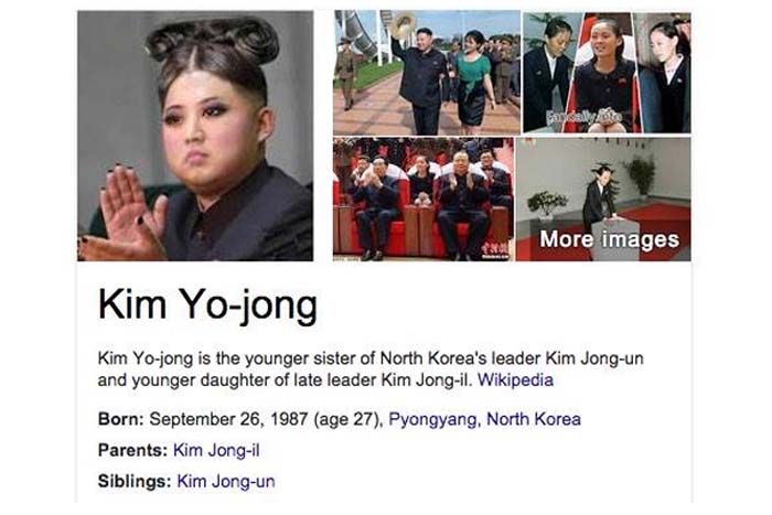 Los usuarios de Google han podido hallar recientemente en sus búsquedas la foto falsa de Kim Yo-jong, la hermana del líder norcoreano Kim Jong-un, revela 'The Independent'. A pesar de que su perfil detalla el nombre y edad correcta su foto en realidad es una imagen modificada con el programa Photoshop de Kim Jong-un que lo muestra como una mujer.