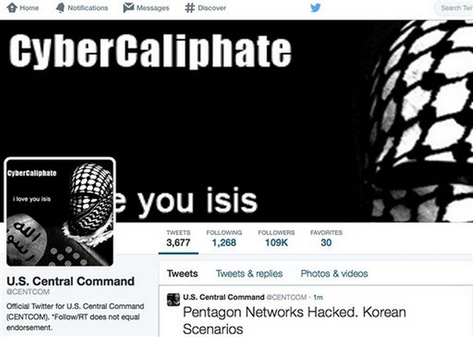 Los piratas cibernéticos titularon el perfil de Twitter "Cibercalifato", con el mensaje destacado que decía "Te quiero ISIS" (la anterior denominación, en inglés, Estado Islámico). Un mensaje más amplio, que hizo referencia a los ataques aéreos en curso contra el grupo Estado Islámico en Irak y Siria, amenazó: "Nos metimos en sus redes y dispositivos personales y sabemos todo acerca de ustedes. Verán que no hay misericordia, infieles. ISIS ya está aquí, estamos en sus PCs, en cada base militar".