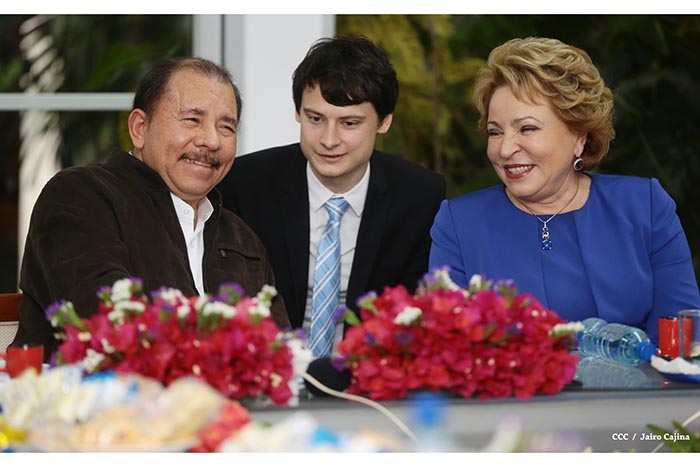 Y aprovechando la ocasión, quiero dar un Saludo en nombre del Pueblo Ruso al Pueblo de Nicaragua.  Nosotros nos alegramos de sus movimientos, de sus éxitos que se logran bajo el Mando de Daniel Ortega.  A pesar de todos los problemas existentes, vemos que Nicaragua se está desarrollando como una Sociedad Moderna, se está desarrollando su Economía, su Sociedad; se está incrementando el Bienestar del Pueblo  nicaragüense, y nosotros nos alegramos de ello.