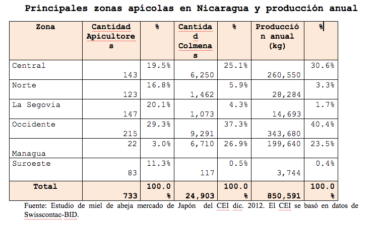 De acuerdo a datos contenidos en el Estudio de Miel de Abeja Mercado de Japón del CEI (diciembre de 2012) en una muestra tomada en los principales departamentos apícolas de Nicaragua, se encontró la existencia de 733 apicultores que tenían en operación 24,903 colmenas y una producción de 850,591 kg. para rendimientos promedios de 34.16 kg por colmena.