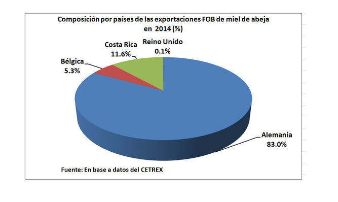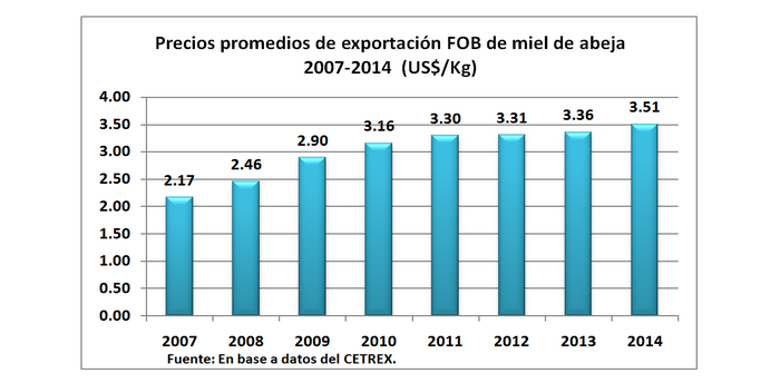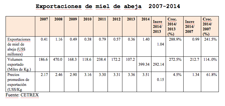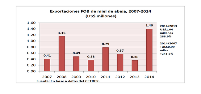 En 2014 el valor de las exportaciones FOB de miel de abeja fue de US$1.4 millones para un incremento de US$1.04 millones (288.9%)con respecto a US$0.36 millones en 2013.
