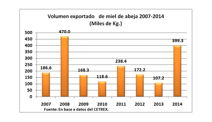 En 2014 se dio un fuerte impulso de las exportaciones de miel de abeja, tanto por mayor volumen exportado (272.5%), como por mayores precios (4.5%).