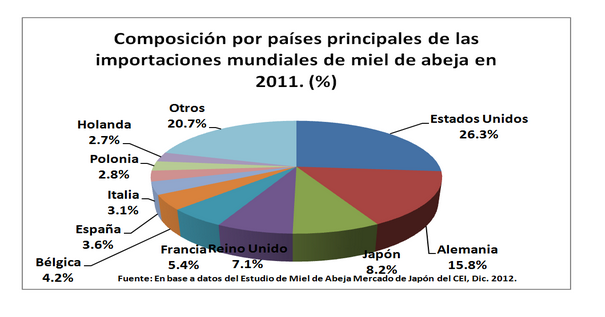 Estados Unidos es el principal importador del miel de abeja en el mundo representando el 26.3% del total en 2011, seguido de Alemania con el 15.8%, Japón con el 8.2%, Reino Unido con el 7.1%, Francia con el 5.4% y Bélgica con el 4.2%. Estos países en conjunto absorben el 67.2% del total.